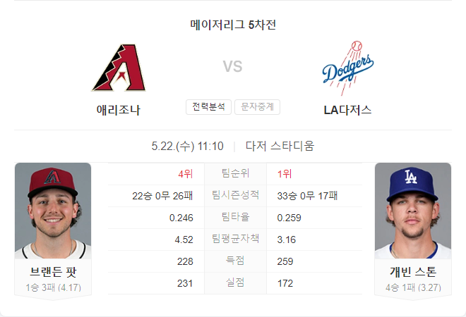 이번 경기에서는 LA 다저스가 우세할 것으로 보입니다. 개빈 스톤은 최근 좋은 폼을 유지하고 있으며, 다저스 타선은 브랜든 파트를 상대로 강한 모습을 보이고 있습니다. 반면, 다이아몬드백스는 최근 일관성 없는 모습을 보이며 투수진의 불안함이 계속되고 있습니다.