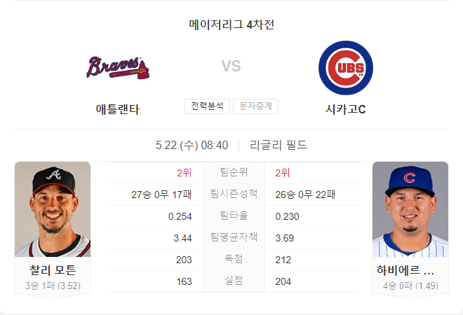 애틀랜타 브레이브스는 현재 27승 17패로 AL 동부 디비전 1위를 기록하고 있습니다. 이번 시리즈의 첫 경기에서 찰리 모튼이 선발로 나서며, 그는 시즌 평균자책점 3.52와 1.15 WHIP를 기록 중입니다. 하지만 시카고 컵스를 상대로는 어려운 경기를 해왔으며, 통산 5.38 ERA와 4승 8패의 기록을 가지고 있습니다.