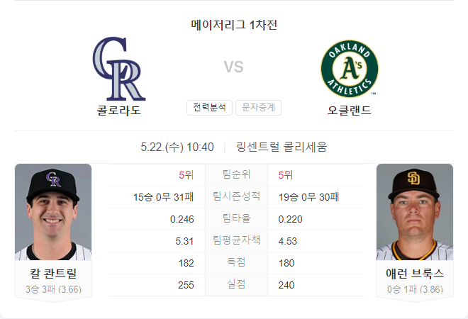 콜로라도 로키스는 최근 타격에서 좋은 모습을 보였고, 칼 퀀트릴이 안정적인 투구를 이어가고 있어 이번 경기에서도 좋은 성적을 기대할 수 있습니다. 반면, 오클랜드 어슬레틱스는 최근 타격과 투수진 모두에서 부진한 모습을 보이고 있어 어려운 경기가 예상됩니다.