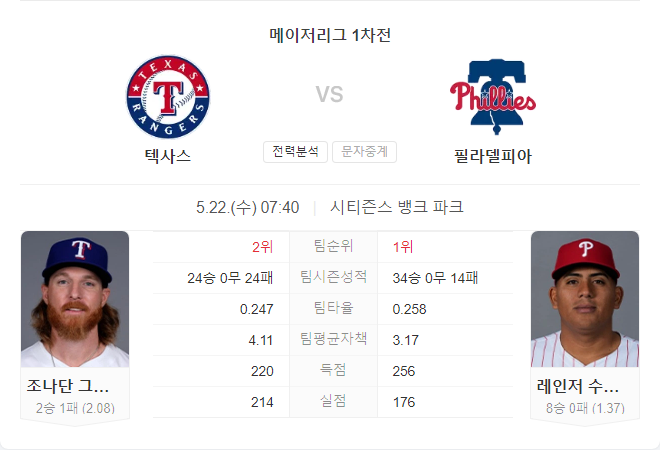 5월 22일 MLB 텍사스 레인저스 VS 필라델피아 필리스 타카짱의 경기 예측 분석