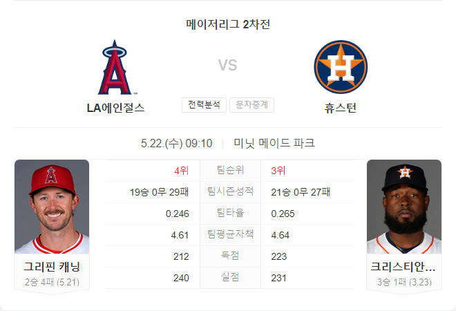 5월 22일 MLB LA 에인절스 VS 휴스턴 애스트로스 타카짱의 경기 예측 분석