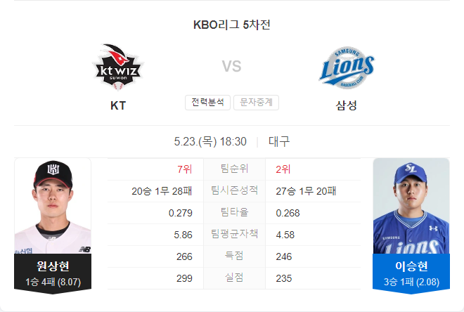 전날 경기에서 삼성은 초반부터 KT의 선발 투수를 공략하며 승리의 기틀을 마련했습니다. 이번 경기에서도 초반부터 원상현을 공략할 가능성이 큽니다. KT의 타격과 이승현의 투구를 고려할 때, 삼성은 초반 리드를 유지할 가능성이 높습니다. 삼성 불펜이 1이닝을 무실점으로 막아낼 수 있다면 승리에 가까워질 것입니다.