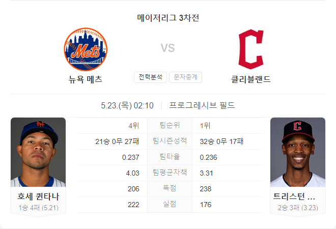 뉴욕 메츠는 이번 시즌 21승 26패로 NL 동부지구 4위를 기록하고 있습니다. 이번 시리즈는 클리블랜드 가디언스와의 유일한 경기로, 첫 경기에서는 1-3으로 패배했습니다. 프란시스코 린도어는 클리블랜드에서 6년 동안 활약한 후 메츠로 이적했으며, 클리블랜드와의 첫 경기에서 0-4로 타석에서 부진했습니다.
