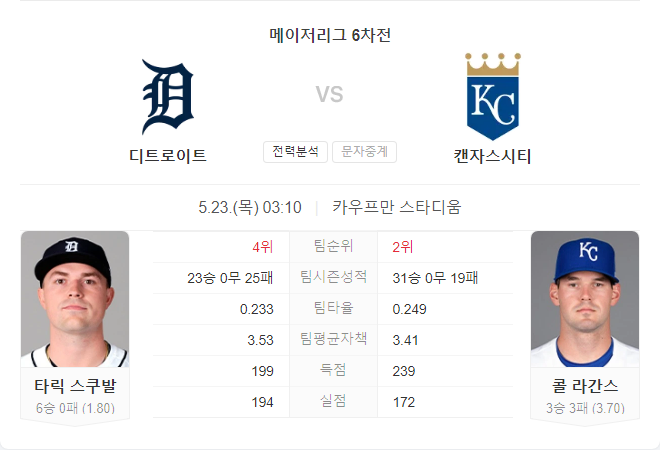 반면, 라간스는 홈 경기에서 다소 기복 있는 성적을 기록하고 있어, 타이거즈가 이번 경기를 승리로 이끌 가능성이 높습니다. 하지만 로열스의 타선이 타이거즈보다 더 강력하다는 점을 감안할 때, 박빙의 승부가 될 것으로 예상됩니다.