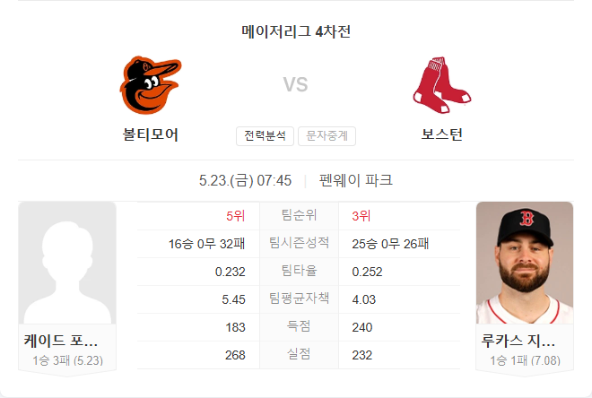 두 팀 모두 선발진에서 불안한 모습을 보이고 있으나, 공격력에서는 보스턴이 확실한 우위를 점하고 있습니다. 케이드 포비치가 원정에서 준수한 피칭을 이어간다면 경기를 접전으로 끌고 갈 수 있지만, 지올리토를 상대로도 최근 타격 침체를 겪은 볼티모어가 이를 극복하기는 쉽지 않아 보입니다. 전반적인 팀 전력과 홈 경기에서의 안정감을 고려할 때, 보스턴이 경기를 가져갈 가능성이 높습니다.