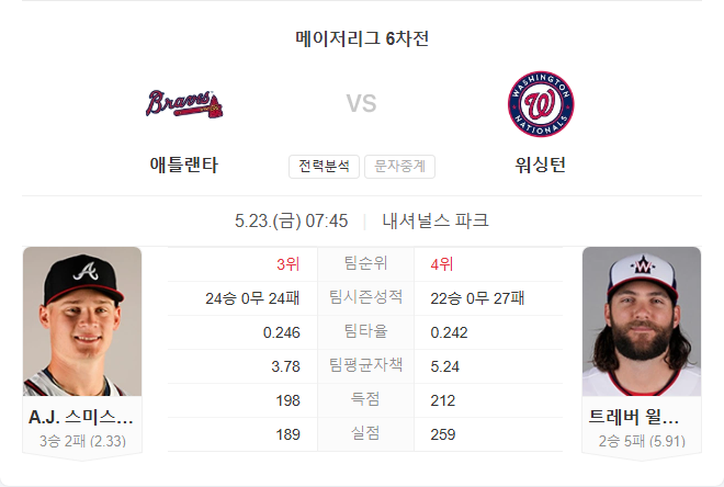 선발 매켄지 고어는 시즌 2승 4패, 평균자책 3.67을 기록하고 있으며, 직전 경기에서는 3.2이닝 2실점으로 조기 강판되었지만 탈삼진 9개를 기록하며 구위를 입증했습니다. 브레이브스 상대로는 통산 3승 2패, 평균자책 3.28로 강한 모습을 보였고, 내셔널스 파크에서도 평균자책 3.65로 준수한 성적을 유지하고 있습니다.