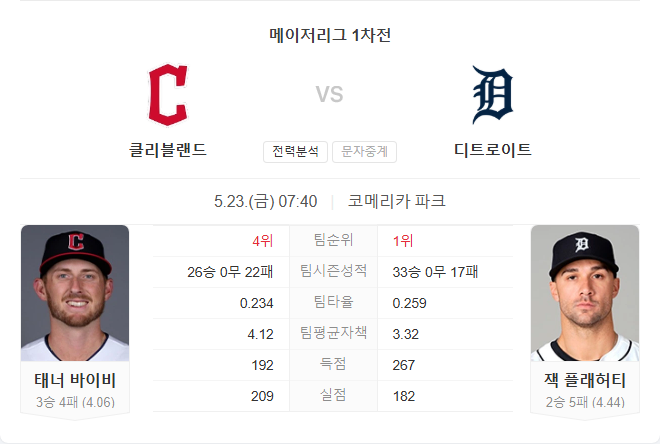 두 팀 모두 타선의 핵심들이 제 역할을 해주고 있으나, 선발 매치업에서는 잭 플래허티가 경험 면에서 앞서는 반면, 세코니는 아직 검증이 덜 된 투수입니다. 디트로이트는 최근 공격력에서의 집중력이 인상적이며, 그린과 토켈슨 중심 타선이 충분한 파괴력을 갖추고 있습니다. 반면 클리블랜드는 출루와 연결 능력은 좋지만, 장타력이 부족하고 세코니가 이닝 소화에 실패할 경우 불펜 의존도가 높아질 수 있습니다. 전반적인 팀 흐름과 홈 경기의 이점을 고려할 때 디트로이트의 승리 가능성이 더 높습니다.