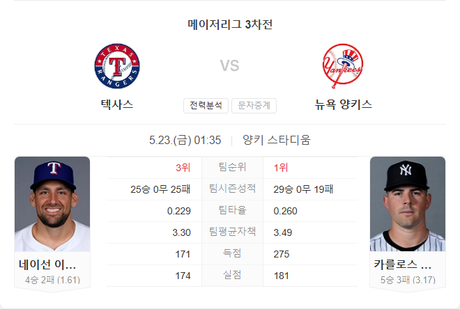 선발 카를로스 로돈은 시즌 5승 3패, 평균자책 3.17, WHIP 0.99를 기록하며 에이스 역할을 충실히 수행하고 있습니다. 5월 들어 3경기에서는 평균자책 2.55로 안정적인 피칭을 이어가고 있으며, 직전 메츠전에서는 5이닝 1실점으로 승리를 따냈습니다. 이오발디와 마찬가지로 컨디션이 좋은 상태이나, 레인저스 타선과의 상성에서는 주의가 필요합니다.