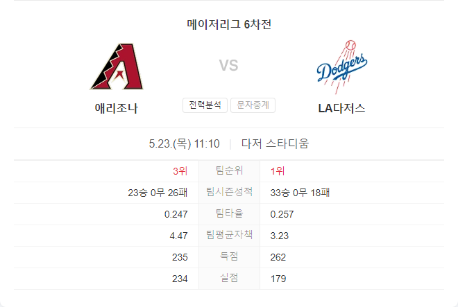 5월 23일 MLB 애리조나 다이아몬드백스 VS LA 다저스 타카짱의 경기 예측 분석