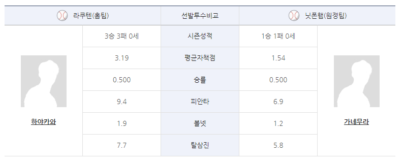 투수진 붕괴로 2경기 연속 대패를 당한 라쿠텐 골든이글스는 하야카와 타카히사(3승 3패 3.19)를 선발 투수로 내세워 연패를 끊으려 합니다. 17일 오릭스 원정에서 7.2이닝 3실점의 호투를 했으나 불펜의 부진으로 승리를 놓쳤던 하야카와는 최근 홈 경기 투구 내용이 좋습니다.