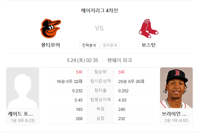 | 5월 23일 MLB 메이저리그 볼티모어 오리올스 VS 보스턴 레드삭스 타카짱의 경기 예측 분석 (0) | 2025.05.23 |