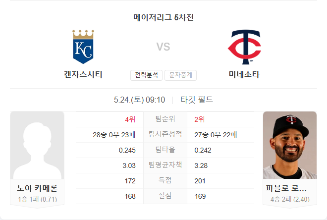 양 팀 모두 리그 상위권 마운드를 갖추고 있으며, 이번 경기는 전형적인 투수전 양상이 예상됩니다. 루키 캐머런은 지금까지의 내용만 보면 매우 인상적이지만, 미네소타 원정이라는 환경과 강한 라인업은 분명 큰 시험대입니다. 반면 로페즈는 이미 캔자스시티를 상대로 꾸준한 호투를 기록해왔으며, 팀 분위기와 최근 흐름 모두 우위에 있습니다.