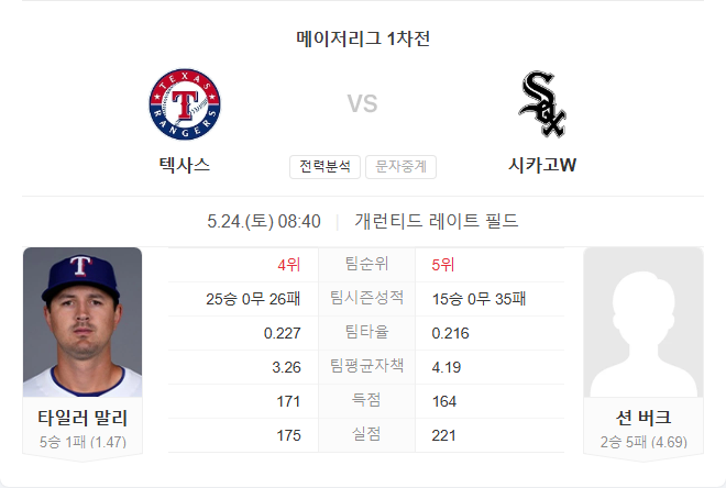 양 팀의 전력 격차는 뚜렷합니다. 텍사스는 타선이 다소 부진하지만, 마일리의 압도적인 선발 투구와 안정된 마운드 운영이 경기를 유리하게 끌고 갈 수 있는 기반을 제공합니다. 반면 화이트삭스는 공격력과 투수력 모두 열세에 있으며, 현재의 경기 흐름을 봐도 반전 가능성이 낮습니다.
