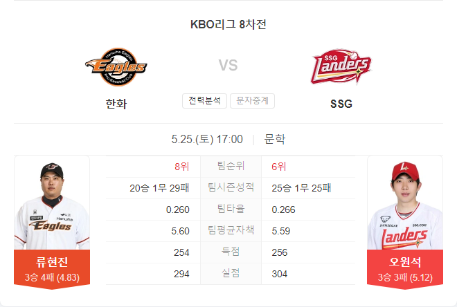 5월 25일 KBO 프로야구 한화 이글스 VS SSG 랜더스 타카짱의 경기 예측 분석