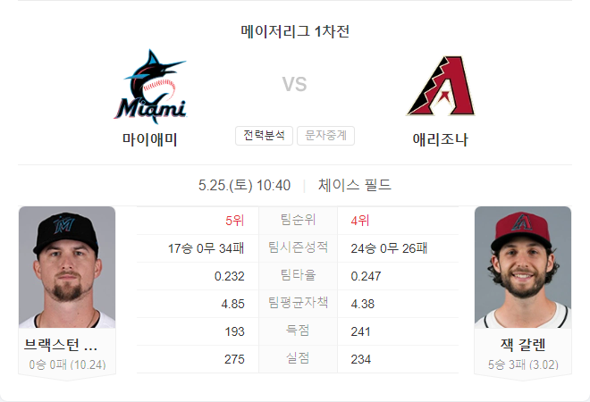 애리조나 다이아몬드백스는 홈에서 강한 잭 갈렌이 선발 등판하는 만큼 유리한 경기를 펼칠 것으로 예상됩니다. 마이애미의 브락스턴 개릿은 이번 시즌 부진한 모습을 보이고 있어, 애리조나 타선이 공략하기 쉬울 것으로 보입니다.