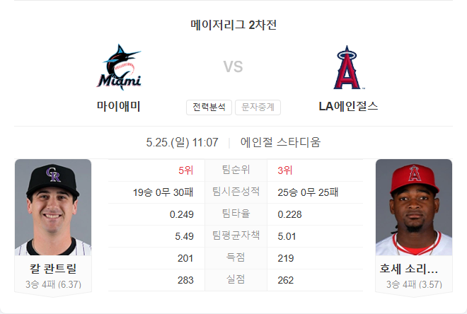 최근 타선이 침묵하고 마운드가 불안한 마이애미는 에인절스의 상승세를 꺾기 어려워 보입니다. 반면 에인절스는 연승 흐름 속에서 타선이 살아났고, 소리아노가 5~6이닝을 안정적으로 소화할 수 있어 전력의 균형이 잡혀 있습니다. 홈 경기라는 이점까지 더해져 우세한 경기 운영이 기대됩니다.