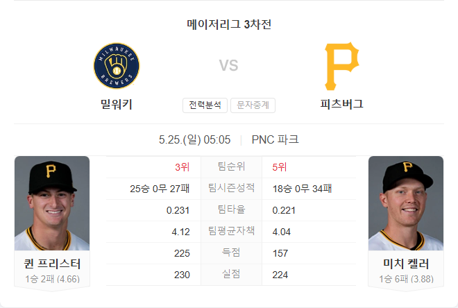 5월 25일 MLB 메이저리그 밀워키 브루어스 VS 피츠버그 파이어리츠 타카짱의 경기 예측 분석