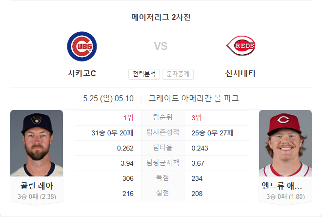 두 팀 모두 최근 좋은 흐름을 보이고 있으며, 마운드의 안정감도 돋보입니다. 하지만 결정적인 차이는 타선의 완성도에서 발생할 수 있습니다. 컵스는 장타력과 주루, 연결 능력 모두에서 레즈보다 한 수 위의 모습을 보여주고 있으며, 리아의 최근 투구 내용은 레즈 타선을 상대하기에 충분히 경쟁력 있습니다.