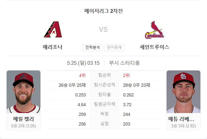 5월 25일 MLB 메이저리그 애리조나 다이아몬드백스 VS 세인트루이스 카디널스 타카짱의 경기 예측 분석
