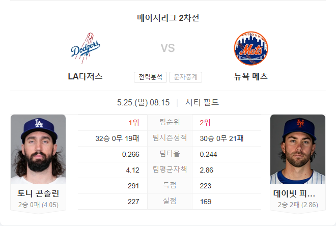 반면 메츠는 홈경기라는 점과 최근 일정이 빡빡했음에도 불구하고 린도어와 알론소 중심의 타선이 꾸준한 생산력을 보여주고 있습니다. 특히 선발 피터슨이 최근 3경기 연속 2실점 이하의 안정된 피칭을 보여주고 있어, 홈에서 강한 모습을 보일 가능성이 높습니다.