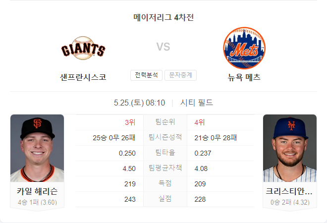샌프란시스코 자이언츠는 최근 좋은 성적을 이어가고 있으며, 특히 카일 해리슨의 안정적인 투구가 큰 힘이 되고 있습니다. 반면, 뉴욕 메츠는 최근 부진한 모습을 보이며, 크리스찬 스콧의 성적도 좋지 않습니다. 이러한 요소들을 고려할 때, 샌프란시스코 자이언츠의 승리가 예상됩니다.