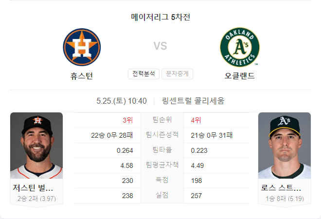 이번 경기에서는 베테랑 투수 저스틴 벌랜더가 선발로 나섭니다. 벌랜더는 이번 시즌 6경기에서 2승 2패, 3.97의 ERA를 기록하고 있으며, 오클랜드 어슬레틱스를 상대로는 통산 16승 8패, 2.64 ERA를 기록하고 있습니다.