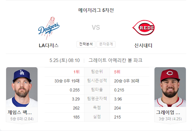 5월 25일 MLB LA 다저스 VS 신시내티 레즈 타카짱의 경기 예측 분석