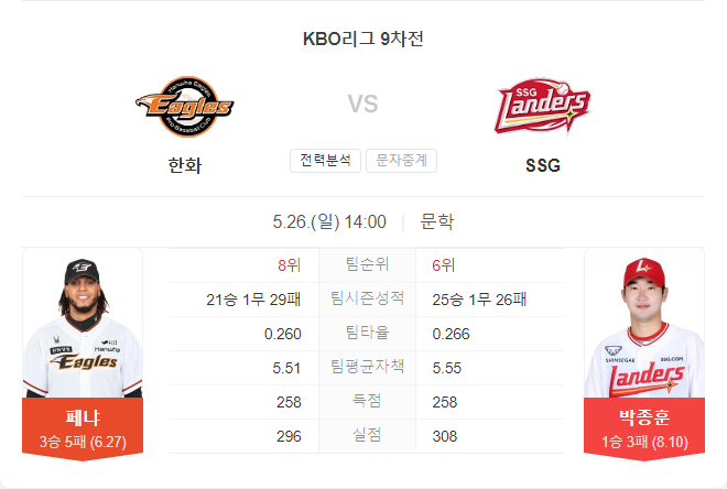 전날 경기에서 류현진과 주현상을 상대로 2점을 올리는 데 그친 SSG의 타선은 홈런이 터지지 않을 때의 문제점이 드러나고 있다. 특히 하재훈의 침묵으로 하위 타선의 파괴력이 급감하고 있다. 마지막을 지키지 못한 문승원은 멀티 이닝 투구가 무리인 듯하다.