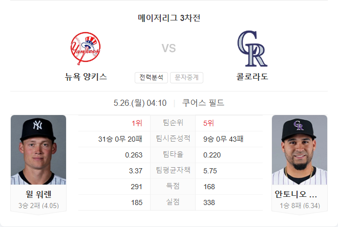 5월 26일 MLB 메이저리그 뉴욕 양키스 VS 콜로라도 로키스 타카짱의 경기 예측 분석