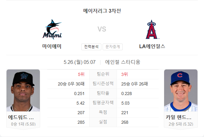 타선이 살아난 에인절스와 투수력이 불안한 말린스의 대결 구도입니다. 에드워드 카브레라가 최근 안정세를 보이고는 있으나, 불펜이 경기를 지탱하기엔 역부족입니다. 반면 에인절스는 헨드릭스가 다소 불안하지만 타선이 이를 상쇄할 수 있는 흐름입니다. 장타력과 집중력을 바탕으로 에인절스가 시리즈 스윕을 달성할 가능성이 높습니다.