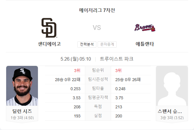 양 팀 모두 최근 하락세에 있으나, 브레이브스는 홈에서 강하고, 타선 흐름이 파드리스보다 낫습니다. 파드리스 선발 시스는 최근 흔들리는 반면, 브레이브스의 슈웰렌바흐는 꾸준한 투구를 이어가고 있어 홈 이점을 등에 업은 브레이브스가 근소한 우세를 점할 것으로 보입니다.