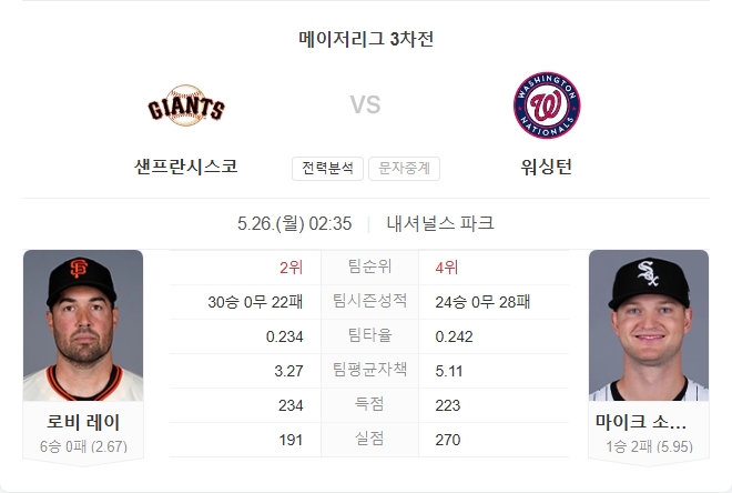 선발 매치업과 팀 전체 흐름 모두 자이언츠가 앞서고 있습니다. 로비 레이는 안정적인 투구 내용과 승리 기여도가 높고, 소로카는 홈에서의 불안한 기록이 큰 약점입니다. 워싱턴이 최근 상승세를 타고 있지만, 투수력과 경험 면에서 샌프란시스코가 우위를 점합니다.