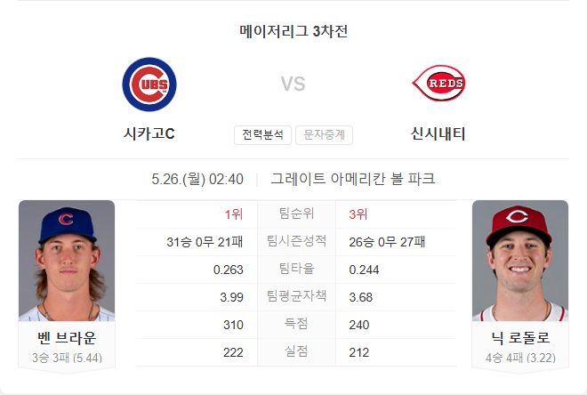 선발 투수 벤 브라운은 시즌 10경기 선발 등판에서 3승 3패, 평균자책점 5.44, WHIP 1.554를 기록 중입니다. 직전 경기인 마이애미전에서는 4.2이닝 6실점으로 부진했으며 최근 3경기 평균자책은 6.60으로 흔들리는 모습입니다. 레즈 상대로는 2경기에서 9이닝 8실점(ERA 8.00)으로 약점을 보이고 있으며, 그레이트 아메리칸 볼파크에서도 패전 경력이 있습니다.
