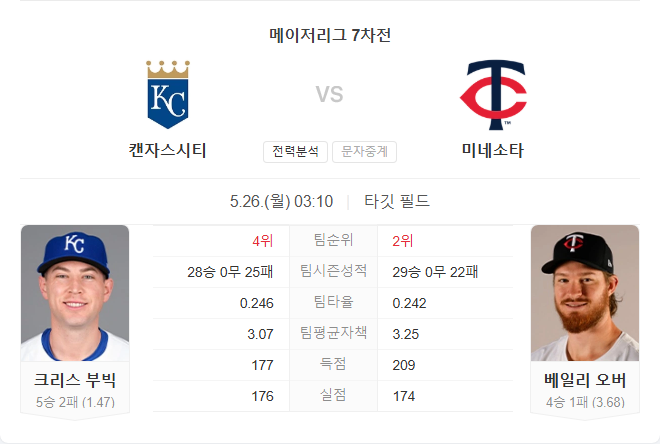두 팀 모두 지구 내 순위 싸움이 치열한 가운데, 선발 투수의 안정감이 승부의 관건이 될 전망입니다. 크리스 부빅은 시즌 내내 안정적인 투구를 보여주고 있고, 최근 트윈스 타선의 무게감도 벅스턴의 공백으로 다소 약화된 모습입니다. 반면, 오버는 짧은 이닝 소화와 함께 불펜 의존도가 높아지는 상황으로 이어지고 있어 로열스가 초반에 주도권을 잡을 경우 승산이 큽니다.
