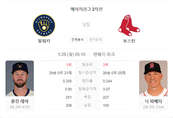 보스턴 레드삭스가 최근의 상승세와 강력한 홈 경기력을 바탕으로 이번 경기에서도 우세할 것으로 보입니다. 밀워키 브루어스의 선발 투수 콜린 레아는 최근 부진한 모습을 보이고 있으며, 보스턴의 강력한 타선은 이를 공략할 가능성이 큽니다. 반면, 보스턴의 닉 피베타는 안정적인 투구를 보여주고 있어 브루어스의 타선을 효과적으로 막을 것으로 예상됩니다.