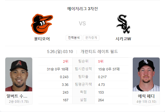 5월 26일 MLB 볼티모어 오리올스 VS 시카고 화이트삭스 타카짱의 경기 예측 분석