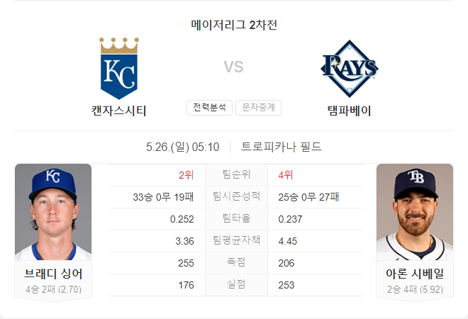 5월 26일 MLB 캔자스시티 로열스 VS 탬파베이 레이스 타카짱의 경기 예측 분석