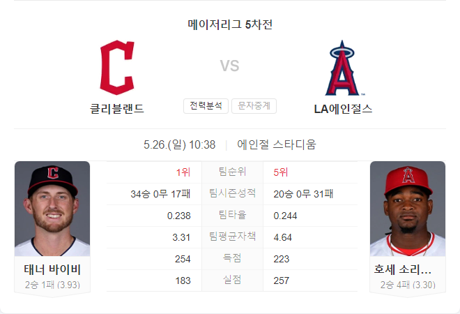 클리블랜드 가디언스는 최근 좋은 성적을 이어가고 있으며, 타너 비비의 안정적인 투구와 강력한 타선의 지원으로 승리를 기대할 수 있습니다. 반면, LA 에인절스는 주요 선수들의 부상과 조세 소리아노의 홈 경기 부진으로 인해 어려운 경기를 펼칠 것으로 예상됩니다.