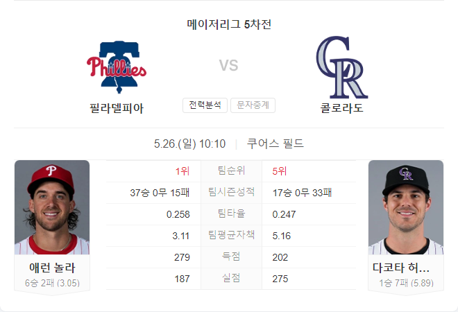 필라델피아 필리스가 강력한 투수진과 타선을 바탕으로 승리할 가능성이 높습니다. 놀라의 안정적인 투구와 봄의 활약이 기대됩니다.