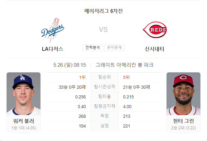LA 다저스는 이번 시즌 33승 19패를 기록하며 강력한 모습을 보여주고 있습니다. 이번 경기에서는 어깨 부상에서 복귀한 후 첫 승을 기록한 워커 뷸러가 선발로 나섭니다. 뷸러는 이전 두 경기에서 부진했지만, 레즈를 상대로 한 마지막 경기에서 6이닝 무실점을 기록하며 반등했습니다.