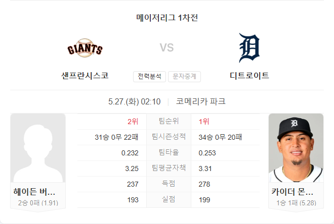 버드송은 안정적인 투구를 이어가고 있으며, 자이언츠는 득점권에서의 집중력이 뛰어납니다. 반면 몬테로는 홈 성적은 좋지만 실점 억제력에 불안 요소가 존재합니다. 타이거즈의 타선이 더 폭발적이긴 하나, 최근 흐름과 투수력에서 자이언츠가 조금 앞서는 모양새입니다.