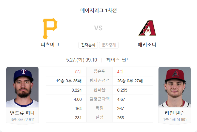 5월 27일 MLB 메이저리그 피츠버그 파이어리츠 VS 애리조나 다이아몬드백스 타카짱의 경기 예측 분석