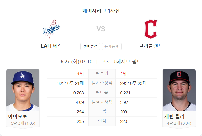 5월 27일 MLB 메이저리그 LA 다저스 VS 클리블랜드 가디언스 타카짱의 경기 예측 분석