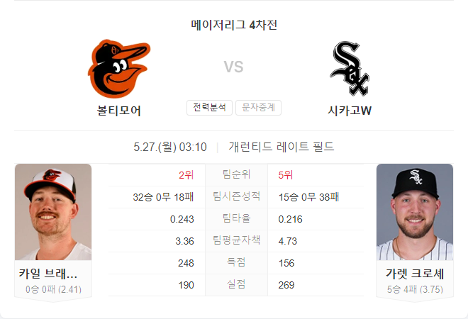 5월 27일 MLB 볼티모어 오리올스 VS 시카고 화이트삭스 타카짱의 경기 예측 분석