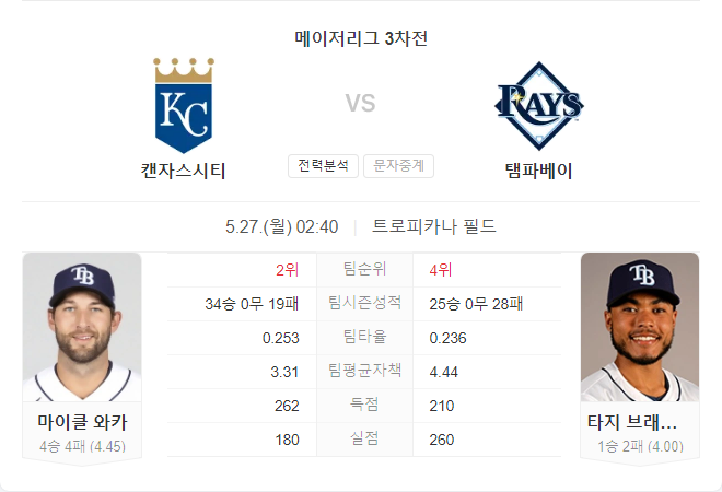 캔자스시티 로열스는 최근 상승세를 타고 있으며, 마이클 와카의 안정적인 투구와 강력한 타선을 바탕으로 탬파베이 레이스를 상대로 우위를 점할 가능성이 높습니다. 반면, 탬파베이 레이스는 최근 성적이 좋지 않으며, 홈에서도 불안정한 모습을 보이고 있습니다. 따라서 로열스가 이번 경기에서 승리할 확률이 높습니다.