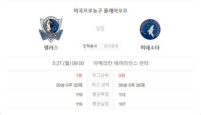 5월 27일 NBA 미네소타 팀버울브스 VS 달라스 매버릭스 타카짱의 경기 예측 분석