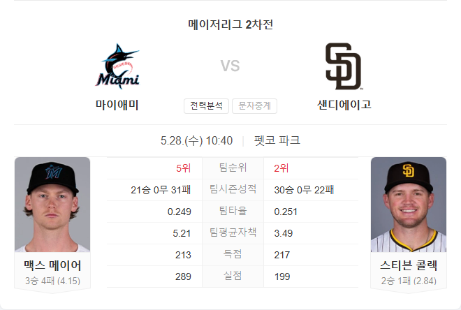 양 팀 모두 타선은 평균 수준이지만, 마운드에서의 차이가 뚜렷합니다. 마이애미는 최근 원정 경기력은 좋지만 시즌 내내 투수진의 불안정이 지속되고 있고, 샌디에이고는 안정된 마운드 운영으로 리그 상위권 수치를 유지 중입니다. 특히 홈에서의 집중력과 불펜 운영에서도 파드리스가 앞서며, 콜렉이 마이어보다 안정적인 흐름을 보여주고 있다는 점도 우세 요소입니다.