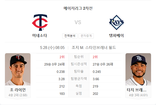 5월 28일 MLB 메이저리그 미네소타 트윈스 VS 탬파베이 레이스 타카짱의 경기 예측 분석
