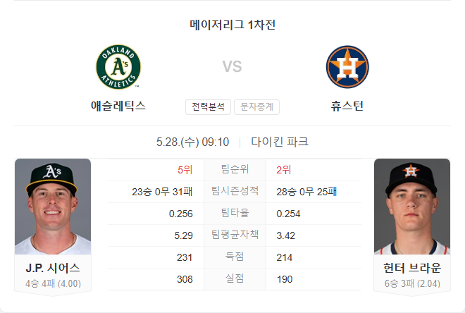 이번 경기 선발 JP 시어스는 시즌 10경기에서 4승 4패, 평균자책점 4.00을 기록 중입니다. 다만 5월 성적은 0승 2패 ERA 5.75로 좋지 않으며, 피홈런이 증가하는 등 흔들리는 모습을 보이고 있습니다. 시어스는 휴스턴을 상대로 커리어 2경기 1패 ERA 3.86의 기록이 있습니다.