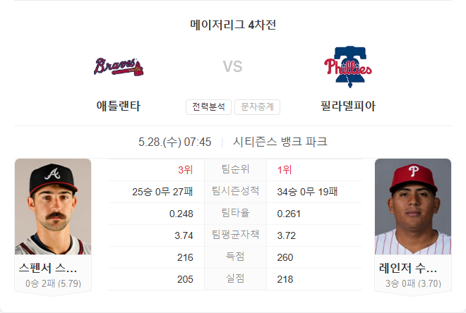 투수진은 평균자책점 3.74로 리그 18위이며, 공격은 경기당 평균 4.15득점으로 전체 18위에 그치고 있습니다. 부상에서 복귀한 스펜서 스트라이더가 선발로 나서며, 그는 복귀 후 4.1이닝 4실점으로 패전을 기록했지만, 필라델피아 상대로는 통산 8승 무패, 평균자책점 2.06으로 절대적 강세를 보이고 있습니다. 타선에서는 맷 올슨(28타점), 마이클 해리스 II(31타점), 오스틴 라일리(필리스전 OPS 1.3)가 핵심입니다.